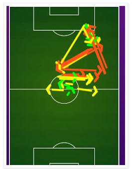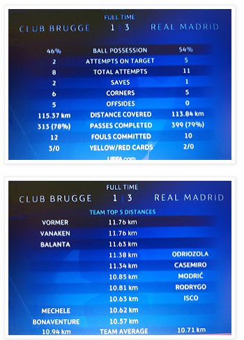 Jalkapallon tv-lähetyksissä on nykyään paljon tilastotietoa tarjolla pelin aikana ja pelin loputtua. Tilastoissa on mm. yksittäisten pelaajien liikkuma kilometrimäärä, syöttötarkkuus, syöttöjen määrä ja pelaajan huippunopeus pelin aikana. Tilastot tuovat mukavan lisän pelin seuraamiseen. Tilastot perustuvat joko Gps-antureihin tai kameroiden keräämään dataan tai niiden yhdistelmiin .Seuraavissa kuvissa on tilastotietoa Mestarien liigan pelistä Glub Brugge vs Real Madrid . Jalkapallopelien kesto on 90-100 minuuttia, joten liikkuminen tapahtuu lyhyemmässä ajassa verrattuna pesäpallopeliin.